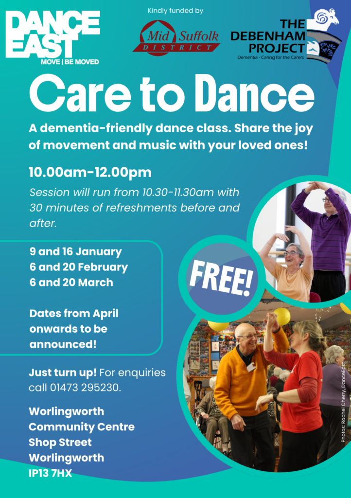Dance East’s ‘Care to Dance’ programme has been designed to be delivered in community Dementia Care settings, that deliver dementia specific activity for family carers, carers and those living with Dementia.